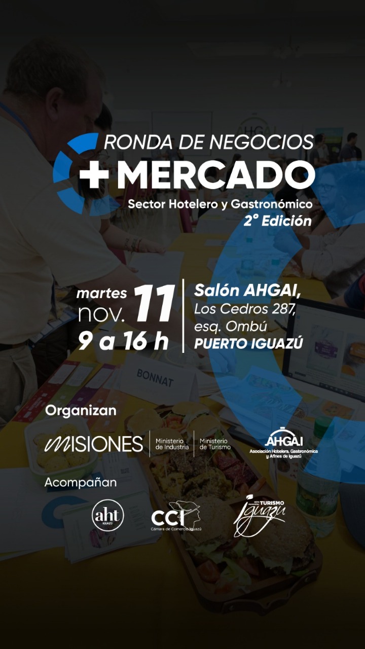PUERTO IGUAZÚ.- El Ministerio de Industria de Misiones anuncia la realización de la Segunda Ronda de Negocios +Mercado Sector Hotelero y Gastronómico | Iguazú 2025, que se llevará a cabo el martes 11 de noviembre de 2025, de 9:00 a 16:00 horas, en el Salón AHGAI - Los Cedros 287, esquina Ombú, Puerto Iguazú. La actividad se realiza junto al Ministerio de Turismo y la Asociación Hotelera y Gastronómica de Iguazú (AHGAI).